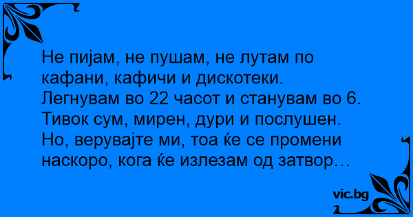 Не пия, не пуша, не се шляя по баровете. Цветко си збори сам на себе: - Не пиjам. - Не пушам. - Си легнувам во 10 вечер, а станувам во 6 сабајле. - Тивок сум, мирен и послушен... ама кога ќе излезам од затвор, се ќе се смени! - Proszę księdza, wydaje mi się, że prowadzę dobre życie. - spowiada się facet. - Nie piję, nie palę, nie chodzę na dziewczyny. O dwudziestej drugiej kładę się spać, wstaję o szóstej. W każdą... Vyrukas per išpažintį sako: - Esu labai padorus: negeriu, vakarais nesišlaistau gatvėmis, nevilioju moterų ir net nežiūriu į jų pusę, guluosi aštuntą valandą vakaro ir kiekvieną sekmadienį einu į... Un tip statea si cugeta : - Sunt un barbat model. Nu beau, nu fumez, nu merg la femei... dar si cand voi iesi din puscarie.... — Я не п'ю, не палю! Не шляюся по бабах, лягаю в 22: 00, встаю в 6: 00. Тихий, спокійний, слухняний... Але, коли я вийду з в'язниці, все різко зміниться.