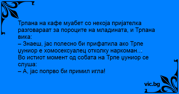 – Знаеш, јас полесно би прифатила ако Трпе џуниор е хомосексуалец отколку наркоман…