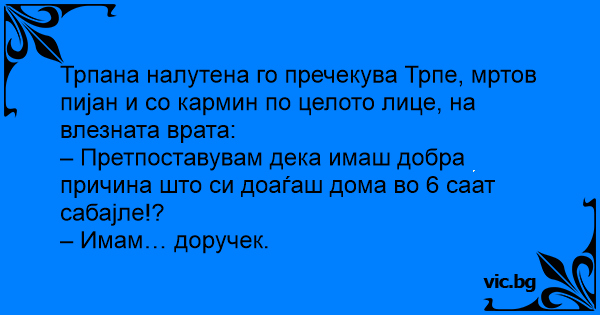 Soţul vine acasă pe la 6 dimineaţa. - Sper că ai motiv bun ca să vii la ora asta, zice soţia. - Da, am, ca să-mi beau cafeaua.
