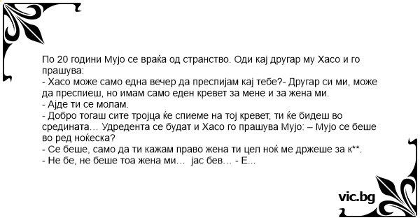 - Хасо може само една вечер да преспијам кај тебе?- Другар си ми, може да преспиеш, но имам само еден кревет за мене и за жена ми.