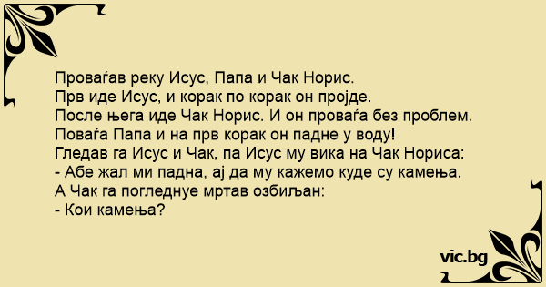 Chuck Norris, Jesus und der Papst sitzen in einem Boot mitten auf dem Meer. Plötzlich steht Jesus auf, betet kurz, steigt aus dem Boot und läuft einige Schritte übers Wasser. Danach steht Chuck auf...