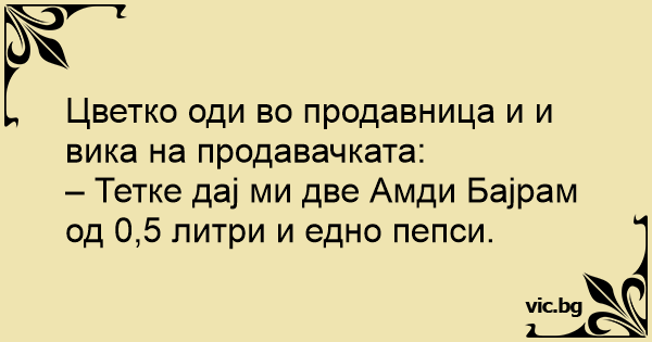 – Тетке дај ми две Амди Бајрам од 0,5 литри и едно пепси.