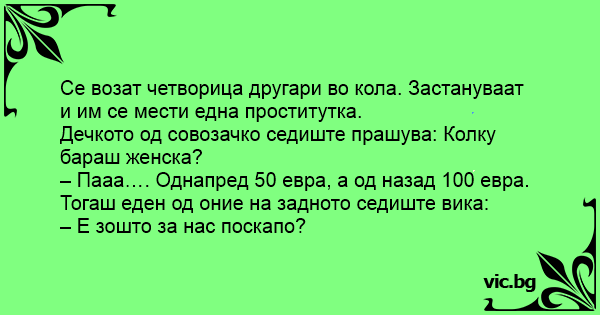 Се возат четворица другари во кола. Застануваат и им се мести една пpoctиtуtka.