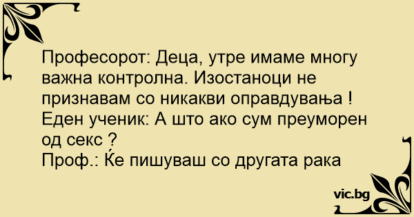 Професорот: Деца, утре имаме многу важна контролна. Изостаноци не признавам со никакви оправдувања !