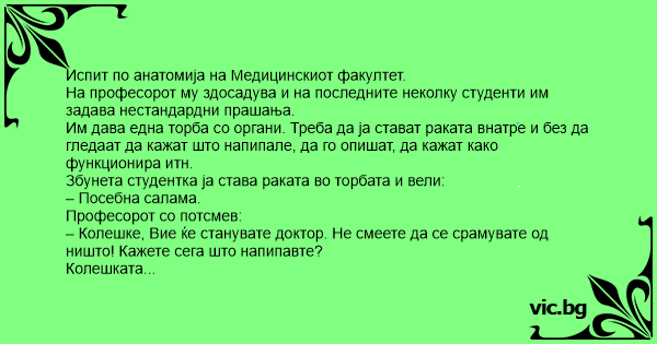– Колешке, Вие ќе станувате доктор. Не смеете да се срамувате од ништо! Кажете сега што напипавте?
