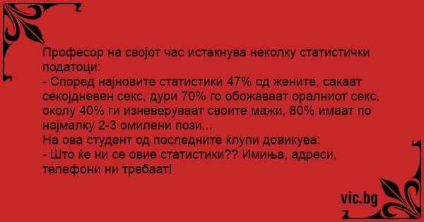 - Според најновите статистики 47% од жените, сакаат секојдневен cekc, дури 70% го обожаваат оралниот cekc, околу 40% ги изневеруваат своите мажи, 80% имаат по најмалку 2-3 омилени пози...
