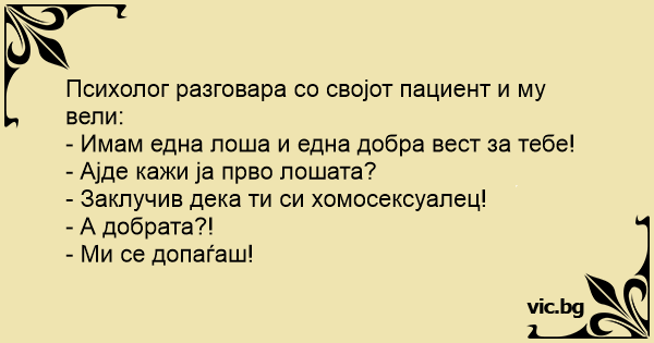 O psicólogo para o paciente: — Acabo de analisar o seu teste de personalidade e tenho boas e más notícias. — Diga-me primeiro a má notícia! — Você tem fortes tendências homossexuais. — E a boa? —...