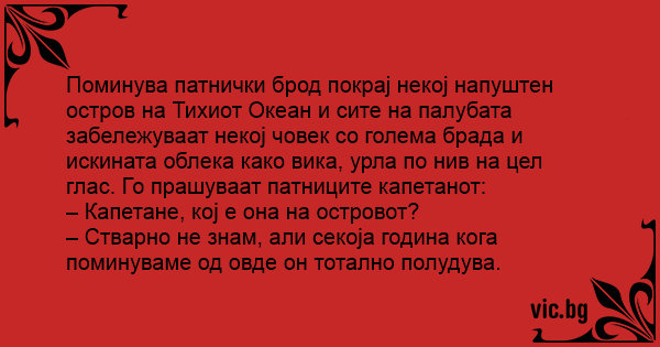 Поминува патнички брод покрај некој напуштен остров на Тихиот Океан и сите на палубата забележуваат некој човек со голема брада и искината облека како вика, урла по нив на цел глас. Го прашуваат патниците капетанот: