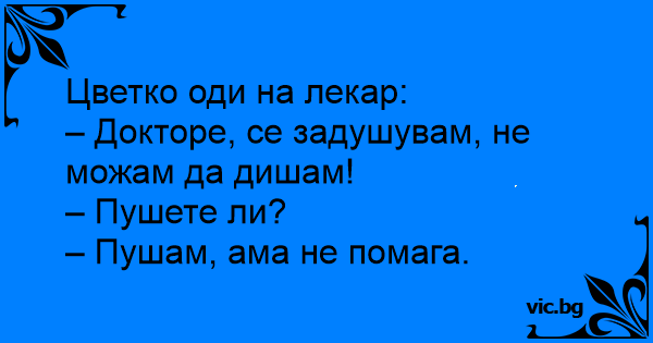 Пациентот: - Докторе, кашлам и тешко дишам. Докторот: - А пушите ли? Пациентот: - Пушам, ама не помага.