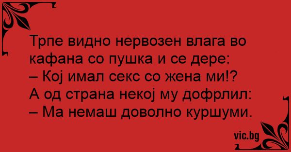Влиза мъж в бар с пушка. - Кой е спал с жена ми? Чува се глас от дъното: - Нямаш достатъчно куршуми, пич!