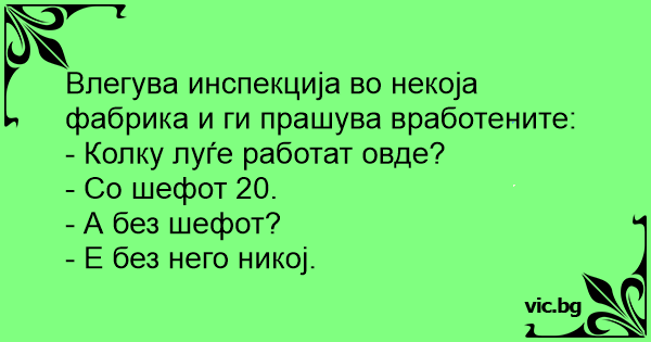 Oди инспекција во некоја фабрика и прашуваат: - Колку луѓе работат во оваа фабрика? - Кога е шефот тука работат 29. - А без шефот?? - Е без шефот не работи никој.