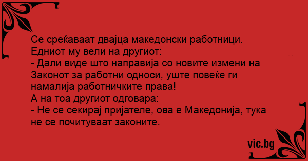 Се среќаваат двајца македонски работници. Едниот му вели на другиот: