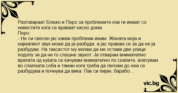 - Не си свесен јас какви проблеми имам. Жената моја и најмалиот звук може да ја разбуди, а јас правам се за да не ја разбудам. На таксистот му велам да ме остави две улици подолу за да не го слушне звукот. Ја отварам внимателно вратата од куќата се качувам внимателно по скалите, влегувам во спалната соба и таман кога треба да легнам до неа се разбудува и почнува да вика: Пак си пијан, барабо една, каде беше до сега? И тоа го зборува три дена.