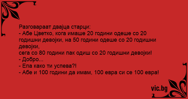 - Абе Цветко, кога имаше 20 години одеше со 20 годишни девојки, на 50 години одеше со 20 годишни девојки,
