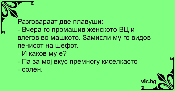 - Вчера го промашив женското ВЦ и влегов во машкото. Замисли му го видов пенисот на шефот.