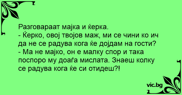 - Ќерко, овој твојов маж, ми се чини ко ич да не се радува кога ќе дојдам на гости?