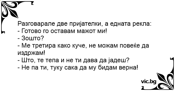 Wie ein Hund behandelt Защо се разведе с мъжа си? - Мамо, реших да напусна мъжа си. Отнася се с мен като с куче - Зашто се разведе од маж ти? En el Juzgado:,- Pero señora ¿por qué se quiere divorciar? ,- Mi marido me trata como a un perro.,- ¿Le pega, la maltrata? ,- NO, quiere que le sea fiel!! — Diga-me, por que motivo você quer divorciar-se de seu esposo? — Meu marido me trata como se eu fosse um cão! — Ele te maltrata? Te bate? — Não, quer que eu seja fiel! -Dígame ¿Cuál es el motivo por el quiere divorciarse de su esposo? - Mi marido me trata como si fuera un perro. - ¿La maltrata... le pega? - ¡No! ¡Quiere que le sea fiel! Una mujer le cuenta a su amiga que va a separarse de su marido. Frente a tal situación la amiga le pregunta: “¿Cuál es el motivo por el cual quieres separarte?” Y sin titubear, la mujer respondió:... Durante una causa di separazione il giudice cerca di convincere una signora a rinunciare al divorzio, ma lei è irremovibile. Alla richiesta del perchè di tanta ostinazione la signora dichiara che... Żona zwierza się przyjaciółce: - Chcę się rozwieść. - Co się stało?! - Mąż mnie traktuje jak psa! - Bije cię? - Nie. Chce, żebym mu była wierna… Le juge demande : - Dites-moi, madame Martin, pourquoi demandez-vous le divorce ? - Mon mari me traite comme un chien, monsieur le juge ! - Ah ? Il vous maltraite ? Il vous empêche de sortir ? -... - Min man ville behandla mig som en hund. - Fruktansvärt, vad ville han du skulle göra då? - Jo, han ville att jag ska bli trogen... Två kvinnor pratar över varsin kopp kaffe: - Min man vill behandla mig som en hund, säger den ena. - Vad vill han? - Jo, säger den första. Han vill att jag ska vara trogen... — Мамо, я вирішила піти від чоловіка, він ставиться до мене як до собаки! — І що ж він робить донечко? — Він вимагає від мене вірності! Późnym wieczorem, leżąc w łóżkach, młode dziewczyny zwierzają się sobie z problemów miłosnych. - Postanowiłam zerwać za swoim chłopakiem - mówi jedna z nich. - Traktuje mnie jak psa! - Jest ci tak... Mais madame, pourquoi voulez-vous divorcer ? - Mon mari me traite comme un chien ! - Il vous maltraite ? Il vous bat ? - Non, il veut que je lui sois fidèle ! Il giudice alla signora: “Mi dica, perche’ vuole divorziare da suo marito?”. “Eh, signor giudice, mi tratta come un cane!”. “La maltratta, la percuote?”. “No, pretende che io sia fedele”. O femeie intră precipitată în cabinetul medicului psihiatru. - Doctore, trebuie să mă ajutaţi, soţul meu este grav bolnav: mă crede câine. - Şi cum se manifestă? - Îmi cere să-i fiu credincioasă... Sotia se plange Psihiatrului: - Sotul meu se poarta cu mine precum cu Un caine! - Cum asa? Va bate? - Nu, vrea Sa-i fiu credincioasa!