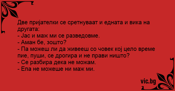 - Защо се разделихте със съпруга си? - А ти би ли издържала да живееш с човек, който пуши, пие, обижда те и те бие? - И той не издържа!
