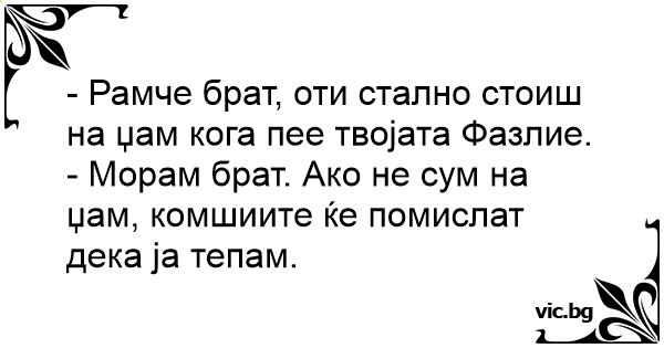 Комшии прават муабет: - Комшија зашто додека жена ти пее, ти секогаш излагаш надвор, или на тераса или на улица? - Па да, не сакам комшиите да помислат дека ја тепам!!