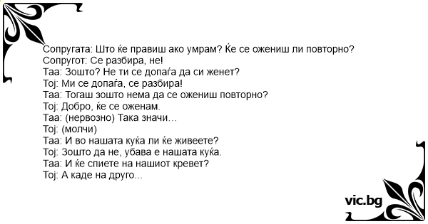 Dialogs starp vīru un sievu: Viņa: Ja es nomirtu, tu precētos ar citu? Viņš: Protams, ka nē mīļā... Viņa: Nē? Kapēc nē? Kā tu viens izdzīvotu? Viņš: Nu ja tev būtu vieglāk - varbūt arī precētos......