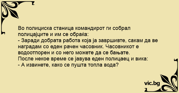 Во полициска станица командирот ги собрал полицајците и им се обраќа: