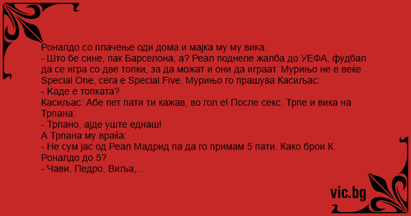 - Што бе сине, пак Барселона, a? Реал поднеле жалба до УЕФА, фудбал да се игра со две топки, за да можат и они да играат. Мурињо не е веќе Special One, сега е Special Five. Мурињо го прашува Касиљас: