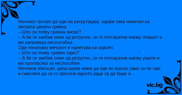 Мечокот тргнал да оди на регрутација, одејќи така налетал на лиската целата среќна.