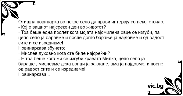 Отишла новинарка во некое село да прави интервју со некој сточар. - Кој е вашиот најсреќен ден во животот? - Тоа беше една пролет кога мојата најомилена овце се изгуби, па цело село ја баравме и после долго барање ја најдовме и од радост сите и се изредивме! Новинаркава збунето: - Мислев духовно кога сте биле најсреќни? - Е тоа беше кога ми се изгуби кравата Милка, цело село ја бараше , мислевме дека волци ја заклале, ама ја најдовме, и после од радост сите и се изредивме! Новинаркава комплетно збунета го прашува? - А најтажен ден кој вие? Чичево се натажува: - Еднаш и ја се изгубив…