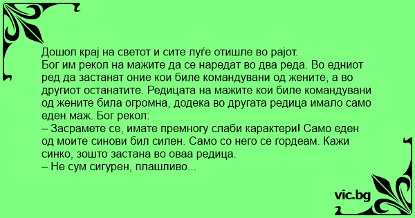 Бог им рекол на мажите да се наредат во два реда. Во едниот ред да застанат оние кои биле командувани од жените, а во другиот останатите. Редицата на мажите кои биле командувани од жените била огромна, додека во другата редица имало само еден маж. Бог рекол: