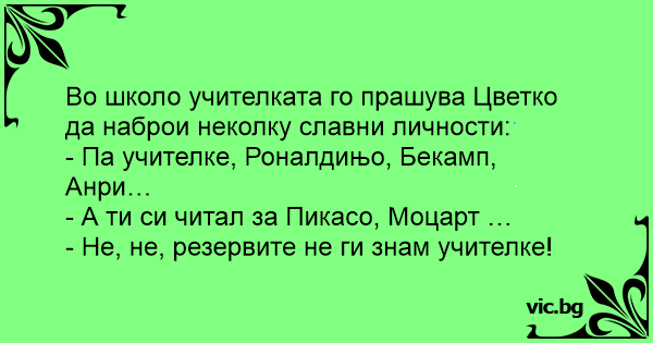 Во школо учителката го прашува Цветко да наброи неколку славни личности:
