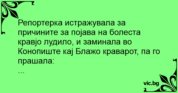 Репортерка истражувала за причините за појава на болеста кравјо лудило, и заминала во Конопиште кај Блажо краварот, па го прашала:
