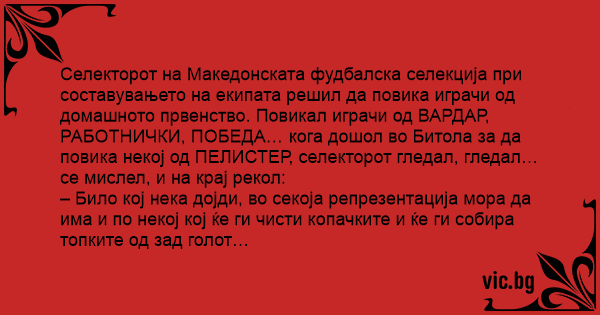 Селекторот на Македонската фудбалска селекција при составувањето на екипата решил да повика играчи од домашното првенство. Повикал играчи од ВАРДАР, РАБОТНИЧКИ, ПОБЕДА… кога дошол во Битола за да повика некој од ПЕЛИСТЕР, селекторот гледал, гледал…се мислел, и на крај рекол: