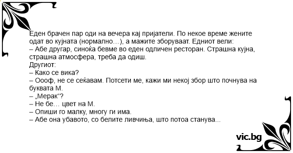 Еден брачен пар оди на вечера кај пријатели. По некое време жените одат во кујната (нормално…), а мажите зборуваат. Едниот вели: