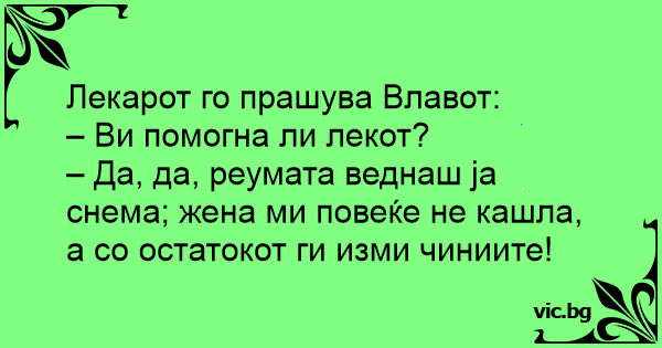 – Да, да, реумата веднаш ја снема; жена ми повеќе не кашла, а со остатокот ги изми чиниите!