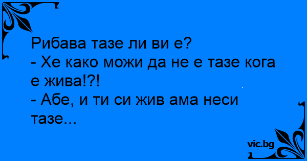 O batranica merge la Pescarie. - Domnu', e proaspat pestele? - Pai nu vedeti ca este viu, cum sa nu fie Proaspat ?! - Bine, bine, maica... raspunde Baba... vie sunt si eu...