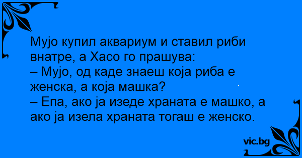 – Мујо, од каде знаеш која риба е женска, а која машка?