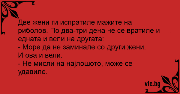 Две жени ги испратиле мажите на риболов. По два-три дена не се вратиле и едната и вели на другата: