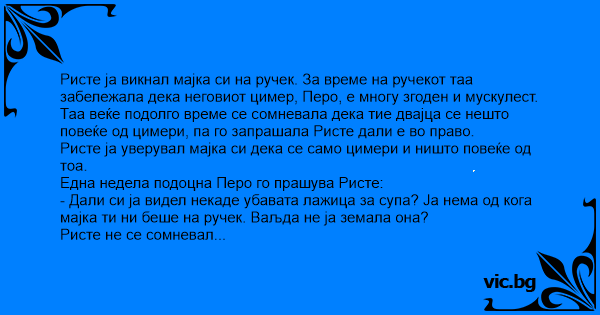 - Драг синко, јас не велам дека ти “спиеш“ или дека “не спиеш“ со Перо, но за чудо, ако Перо спиеше во “својот кревет“ веќе одамна ќе ја најдеше лажицата за супа! Поздрав, Мама.