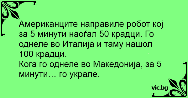 В Японії винайшли робота, який ловить крадіїв. — В Японії за 5 хвилин спіймали 100 крадіїв. — В Америці за 5 хвилин спіймали 200 крадіїв. — В Росії за 5 хвилин хтось украв робота.