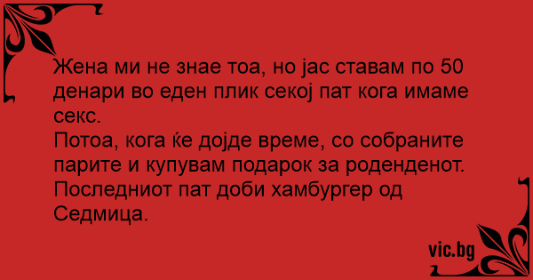 Жена ми не знае, но всеки път като правим секс слагам по левче в един буркан. Със събраните пари и купувам подарък за рожденният и ден.
