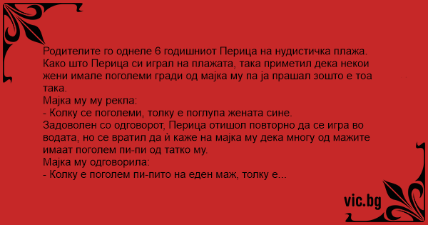 Родителите го однеле 6 годишниот Перица на нудистичка плажа. Како што Перица си играл на плажата, така приметил дека некои жени имале поголеми гради од мајка му па ја прашал зошто е тоа така.