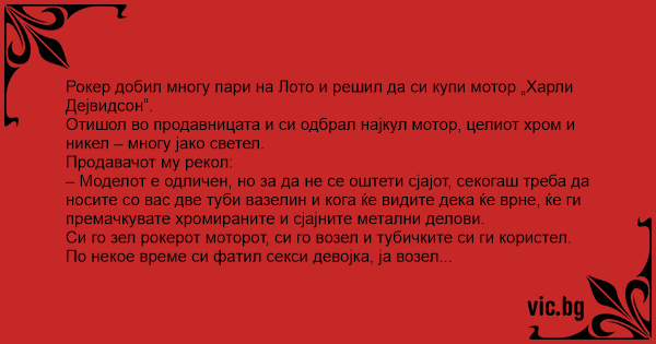 Рокер добил многу пари на Лото и решил да си купи мотор „Харли Дејвидсон“.