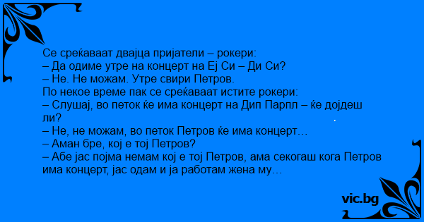 – Абе јас појма немам кој е тој Петров, ама секогаш кога Петров има концерт, јас одам и ја работам жена му…
