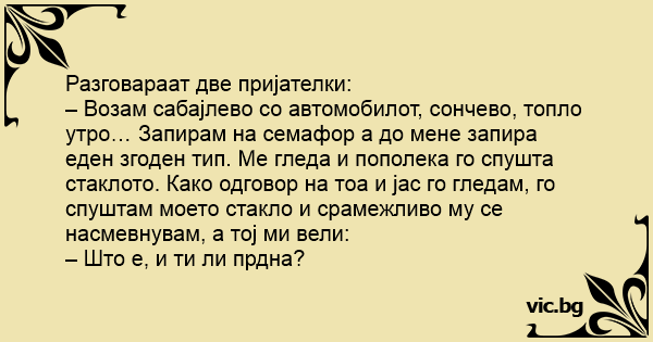 – Возам сабајлево со автомобилот, сончево, топло утро… Запирам на семафор а до мене запира еден згоден тип. Ме гледа и пополека го спушта стаклото. Како одговор на тоа и јас го гледам, го спуштам моето стакло и срамежливо му се насмевнувам, а тој ми вели: