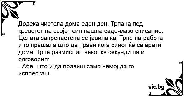 Целата запрепастена се јавила кај Трпе на работа и го прашала што да прави кога синот ќе се врати дома. Трпе размислил неколку секунди па и одговорил: