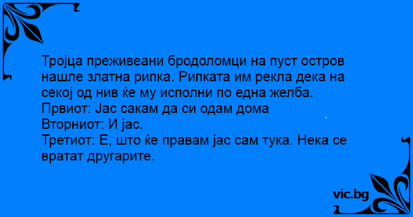 Тројца преживеани бродоломци на пуст остров нашле златна рипка. Рипката им рекла дека на секој од нив ќе му исполни по една желба.