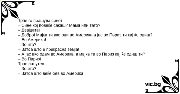 – Добро! Мајка ти ако оди вo Америка а јас во Париз ти кај ќе одиш?