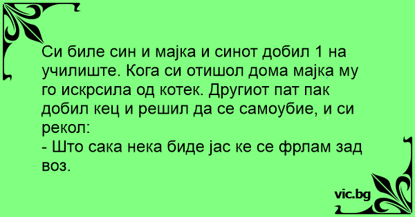 Си биле син и мајка и синот добил 1 на училиште. Кога си отишол дома мајка му го искрсила од котек. Другиот пат пак добил кец и решил да се самоубие, и си рекол: