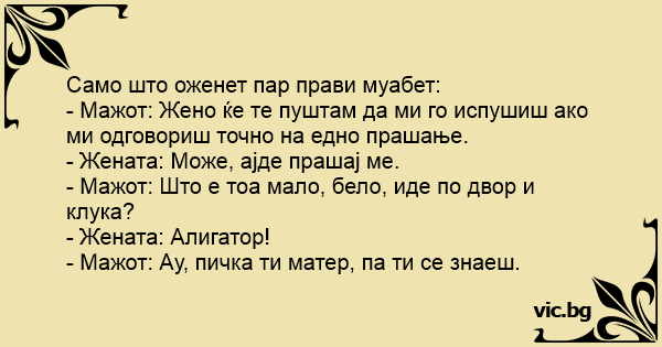 - Мажот: Жено ќе те пуштам да ми го испушиш ако ми одговориш точно на едно прашање.