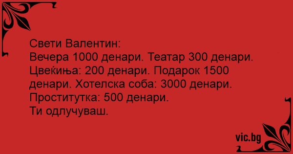 Вечера 1000 денари. Театар 300 денари. Цвеќиња: 200 денари. Подарок 1500 денари. Хотелска соба: 3000 денари.